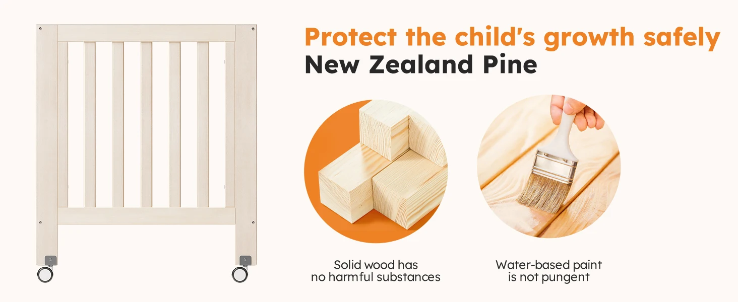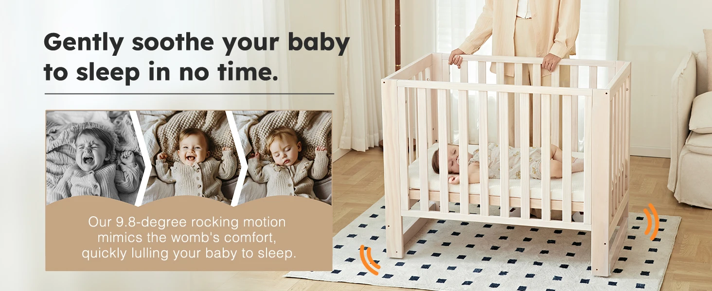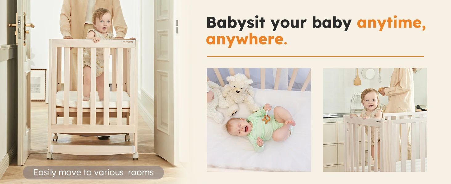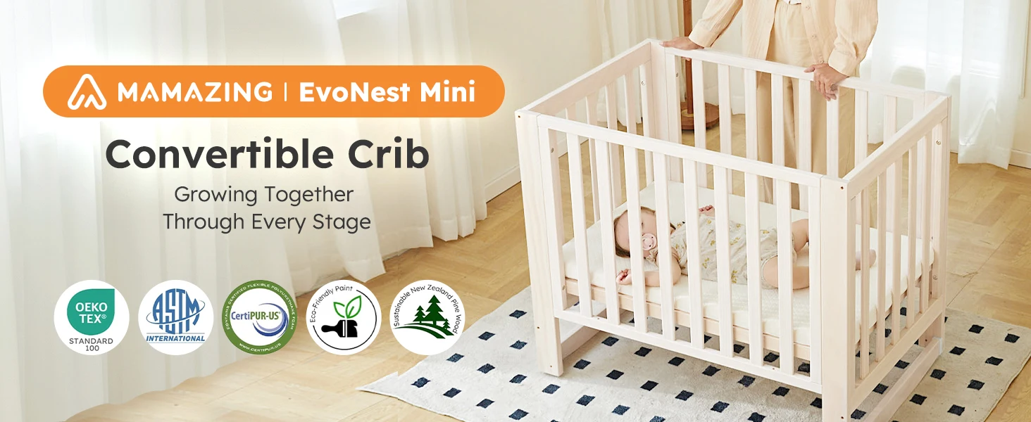 6-in-1 Portable Convertible Mini Crib With Mattress & Removable Wheels, 100% New Zealand Wood Growing Bed, Washed Natural