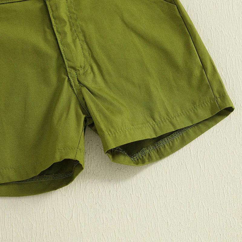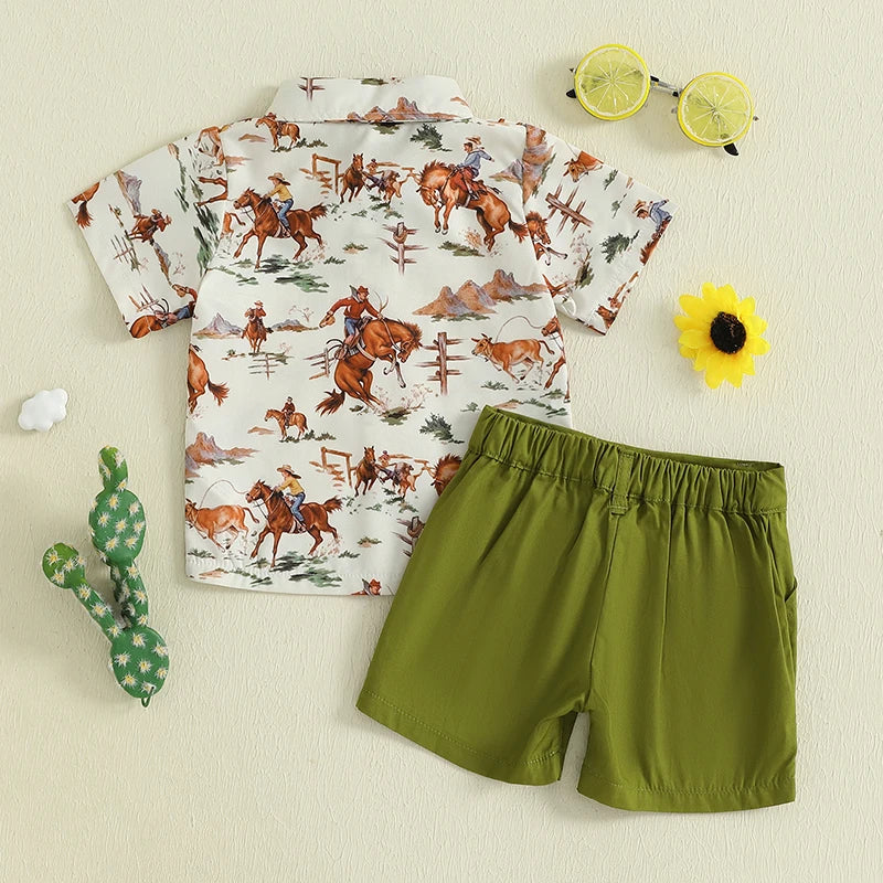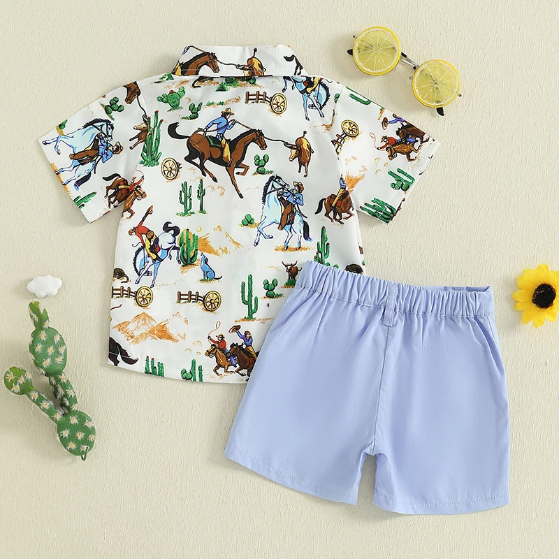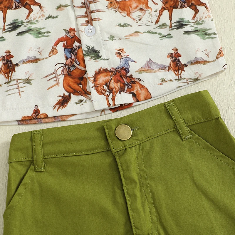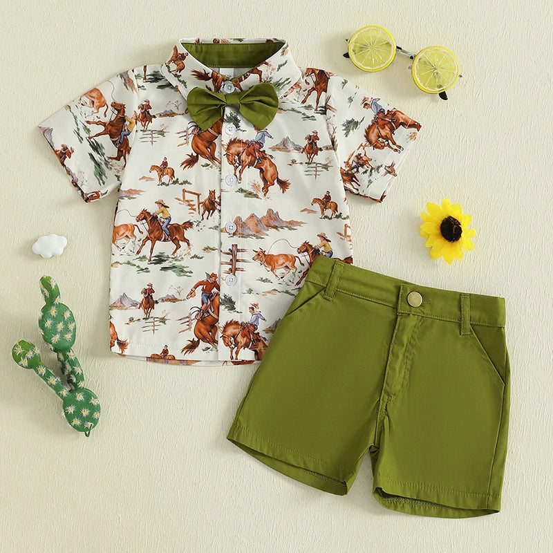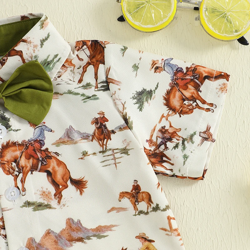 Western element print; Baby boy shirt with short sleeves, bow tie, front button closure and lapel collar; Toddler shorts with belt loops, elastic waist design ensures a comfortable fit, perfect for daily wear