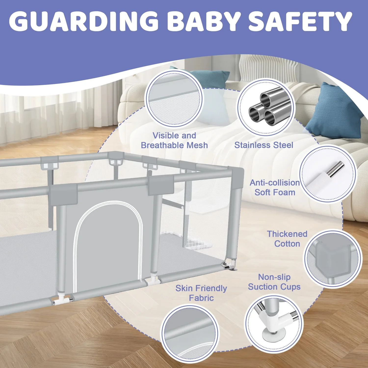Baby play yard is made of durable skin friendly fabric and strong steel pipe. There are 4 sturdy safety non-slip suction cups on the bottom, which are difficult to move or tip over. The steel pipes in the middle and top are encased in soft, thick Oxford cloth and sponge, and the corners of the fence are wrapped in thicked cotton,preventing children from being hit while playing. Our play yard is entirely wrapped in soft cloth, there is no exposed gap, there is no danger of pinching, and it is safer than plastic baby playpen.
