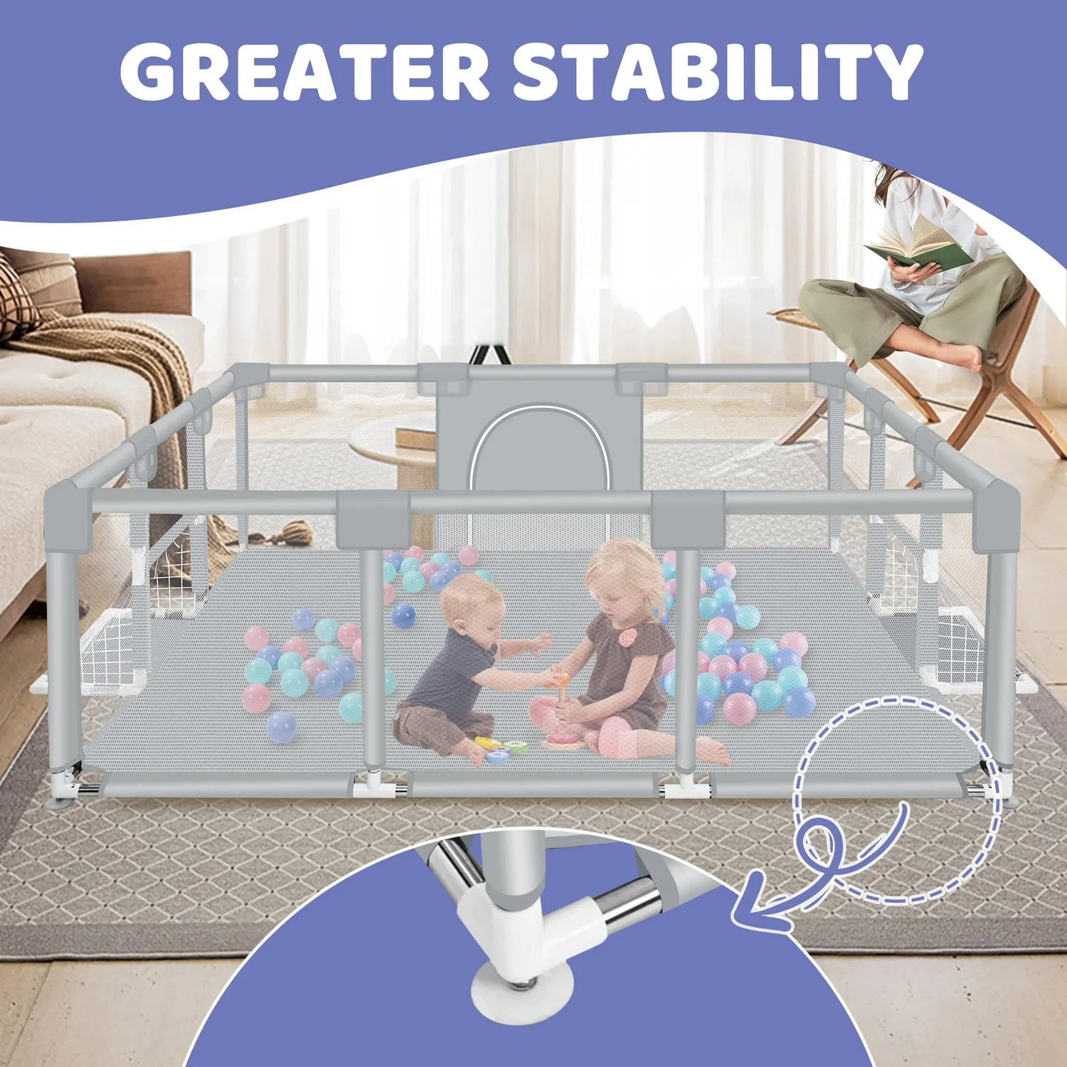 When parents need a few minutes to go to the toilet,reading, or get busy with other things, ANGDUO 71*48*26 in playpen provides a secure enclosed space for their baby to freely explore, allowing parents to relax knowing their children are safe. Our baby play yard was crafted from robust Oxford material, tear-resistant fabric, and strengthened with sturdy steel pipes,prioritizing your baby's safety above all.The gap-free design ensures your little one can't pinch themselves or escape unsupervised.The steel pipes in the middle and top are encased in soft, thick Oxford cloth and sponge, reducing the risk of bumps and bruises.Non-slip suction cups secure the base, even when pressure is applied.The external zipper adds another layer of safety by preventing their baby from opening the door from the inside.The 360-degree panoramic view enables parents to keep an eye on their little adventurers at all times.The playpen is large enough to accommodate multiple kids, assembled effortlessly without any tools.
