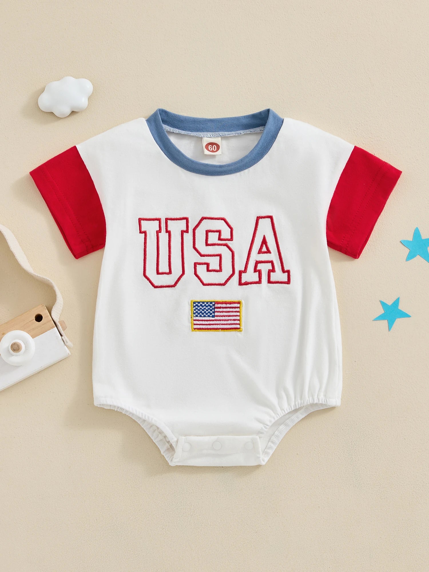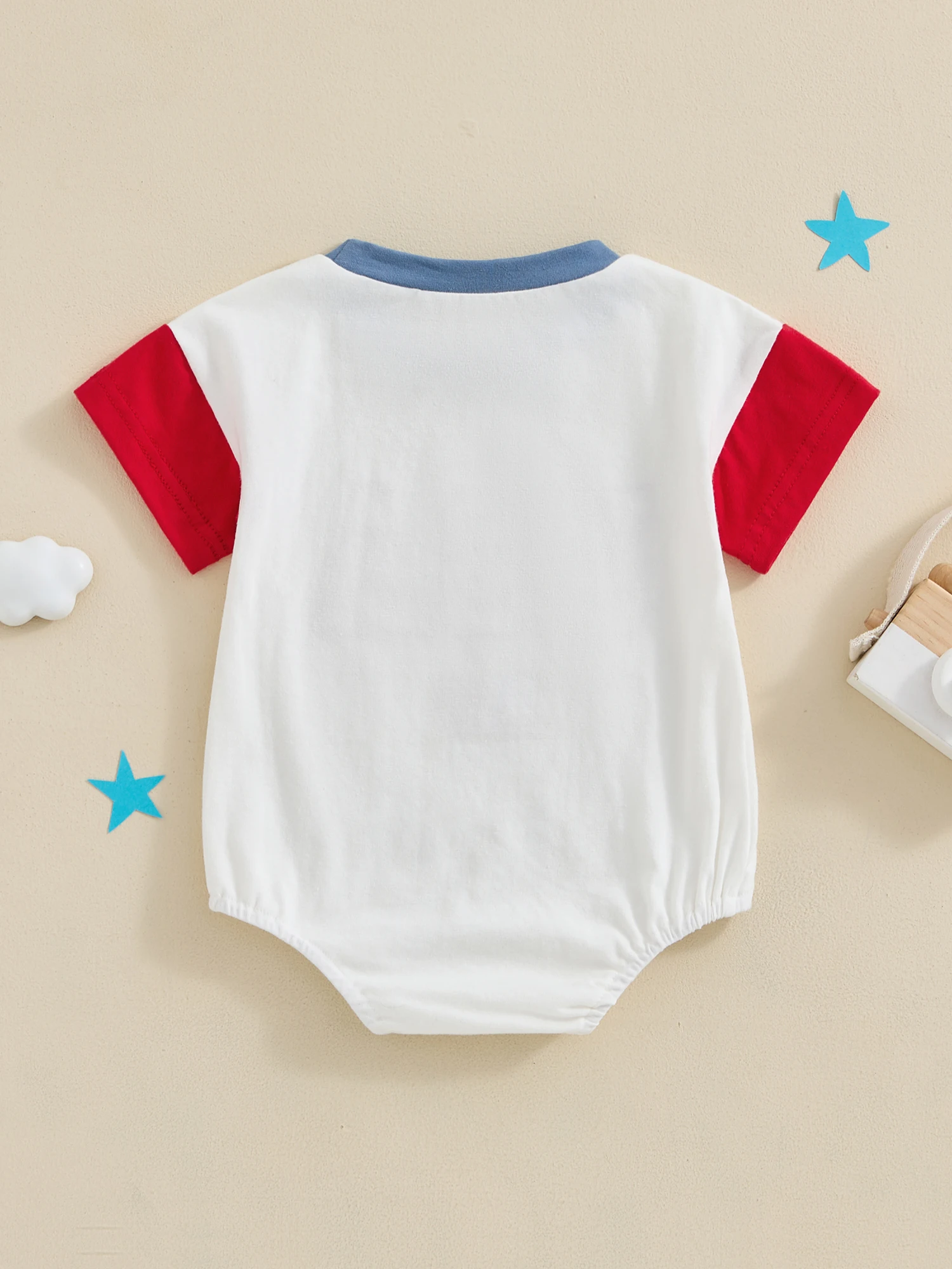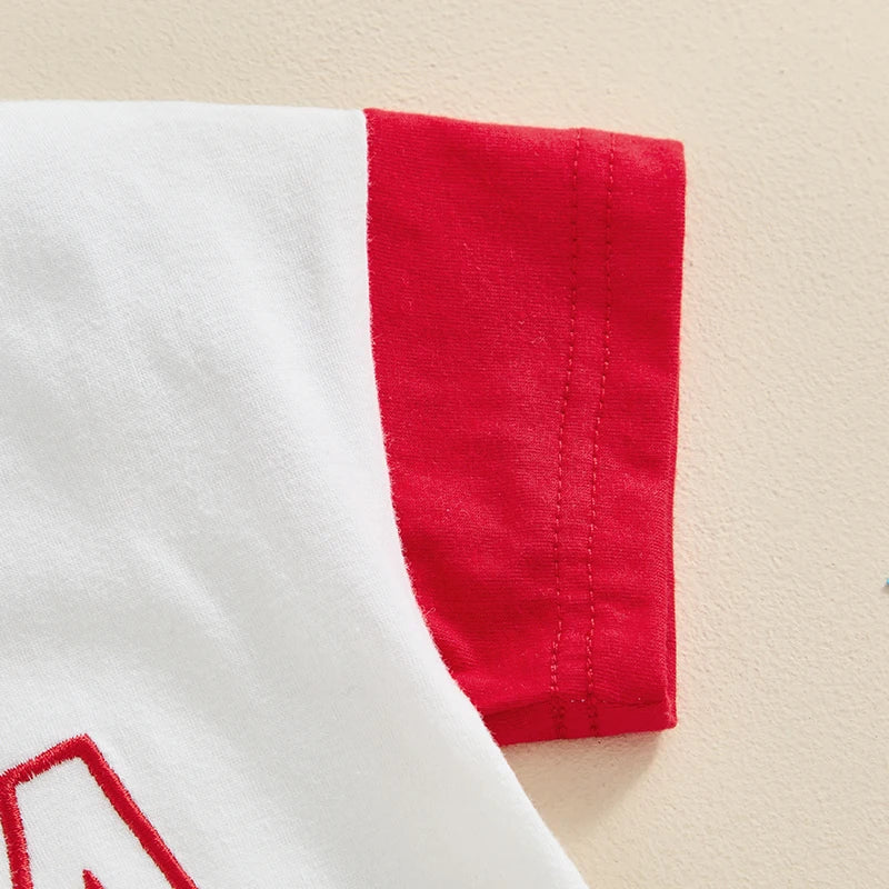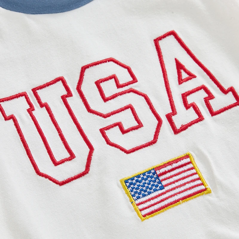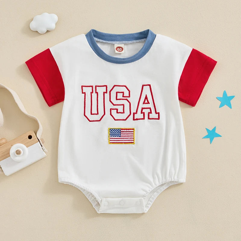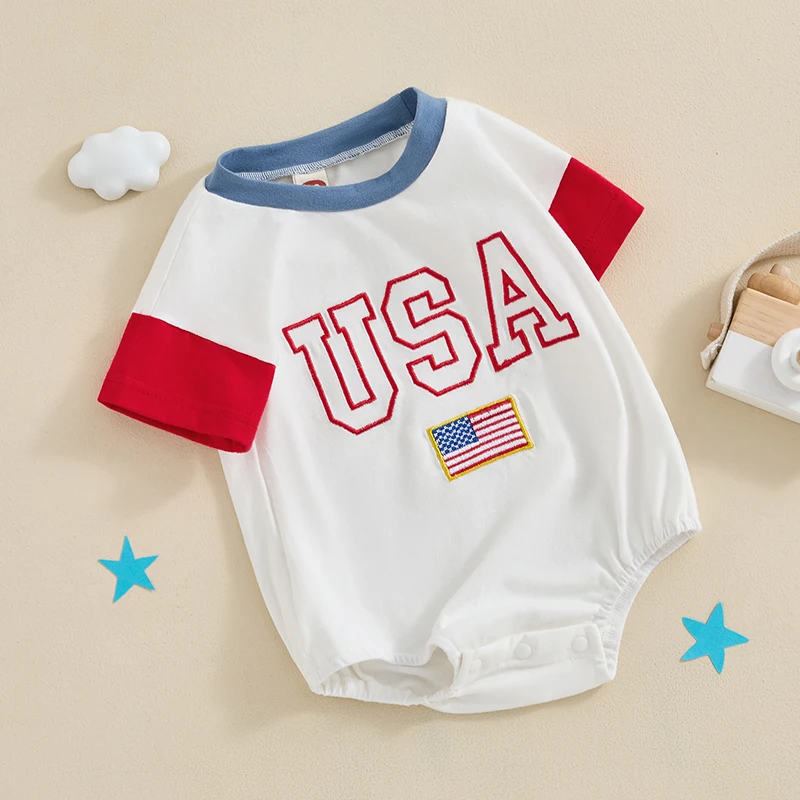 Baby 4th of July Romper Short Sleeve Round Neck Letter Flag Embroidery Bodysuit Infant Playsuit