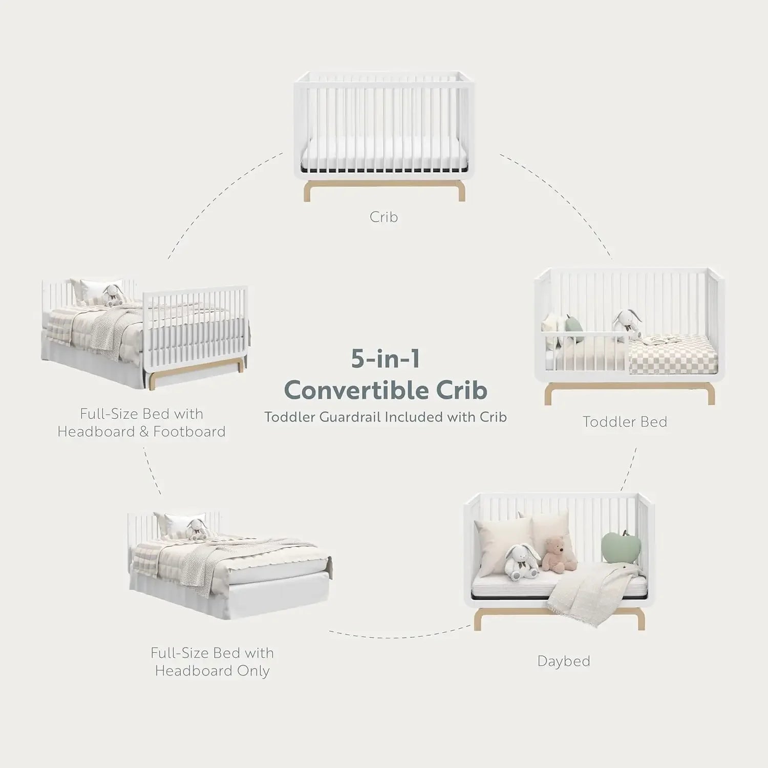 Santorini Deluxe 5-in-1 Convertible Crib with Bonus Toddler Guardrail (White with Driftwood) – Toddler Guardrail Included in Box, Fits Standard Crib Mattress