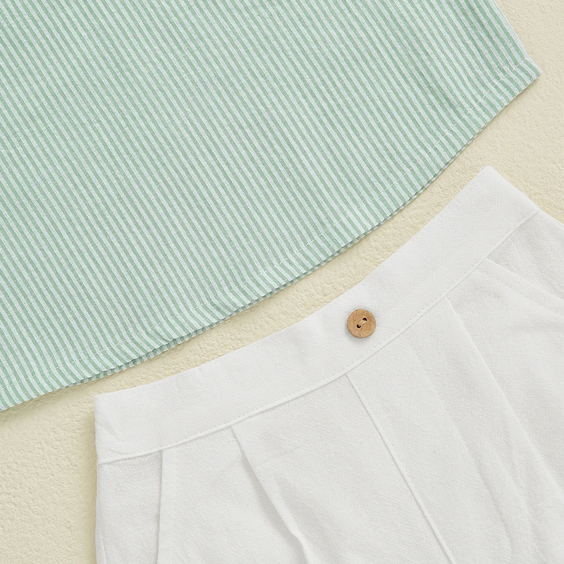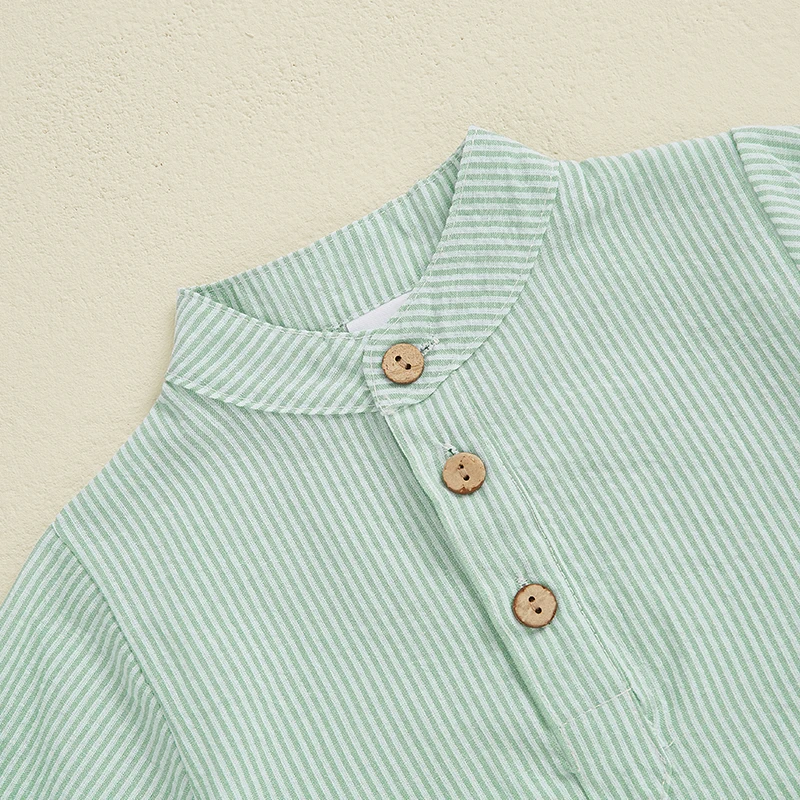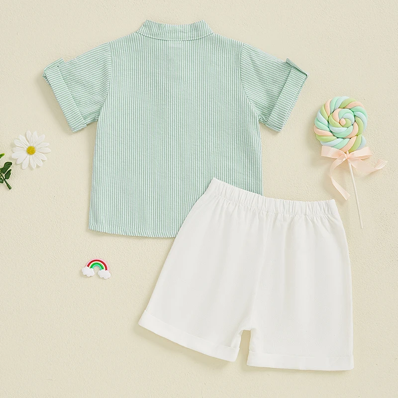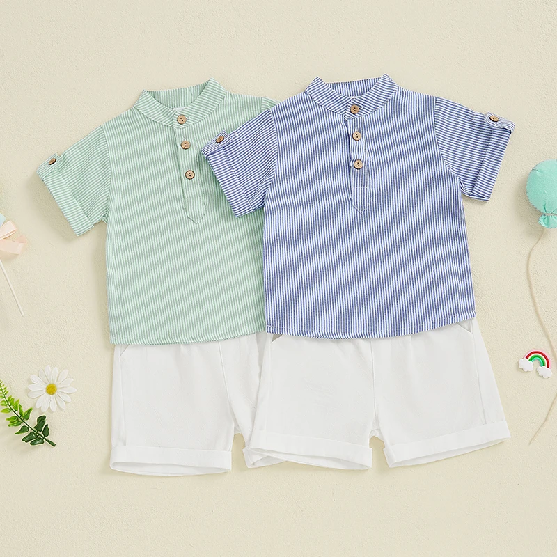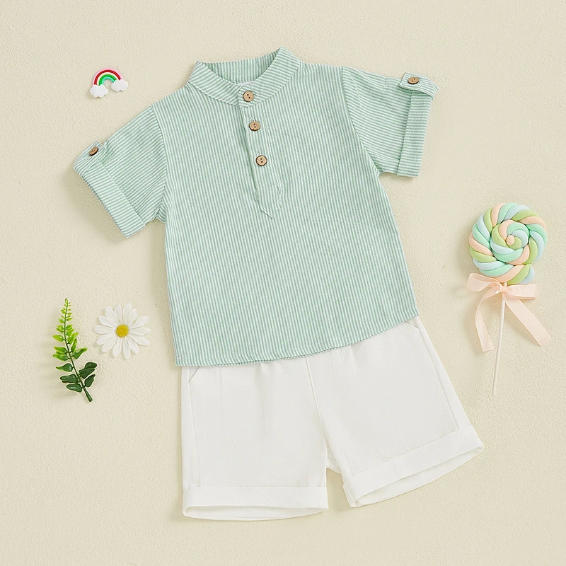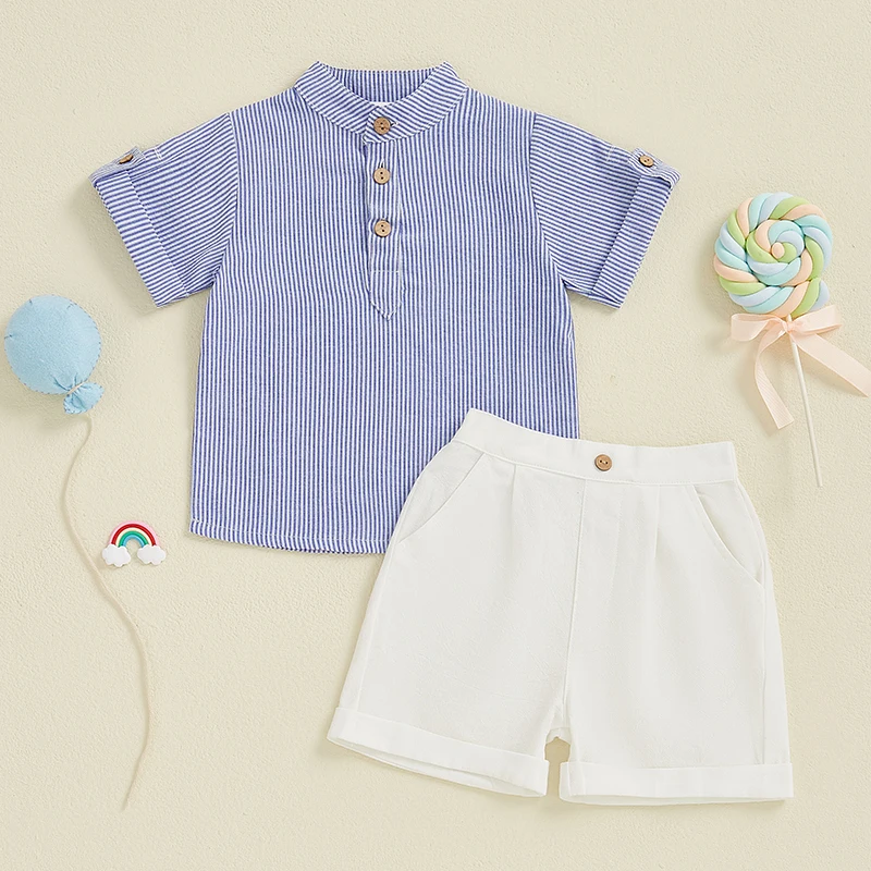 Baby Toddler Boy Summer Outfit Striped Half Button-up Round Neck Short Sleeve Tops Solid Shorts 2 Pcs Set